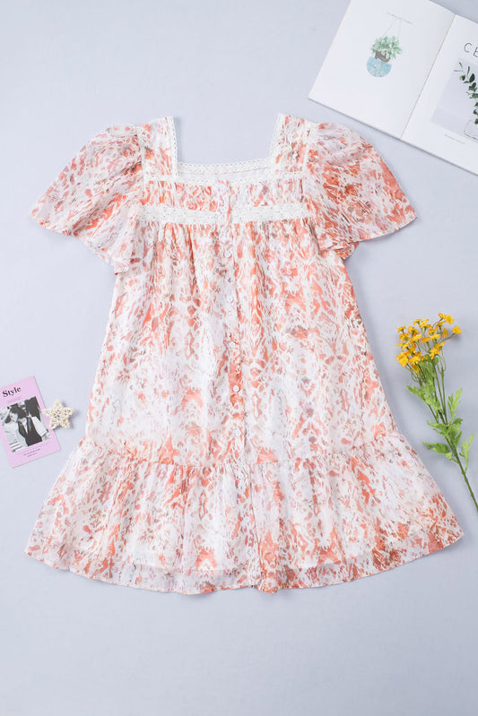 Pattern type: Printed Style: Cute Features: Lace, Buttoned Neckline: Square neck Length: Mini Sleeve length:...