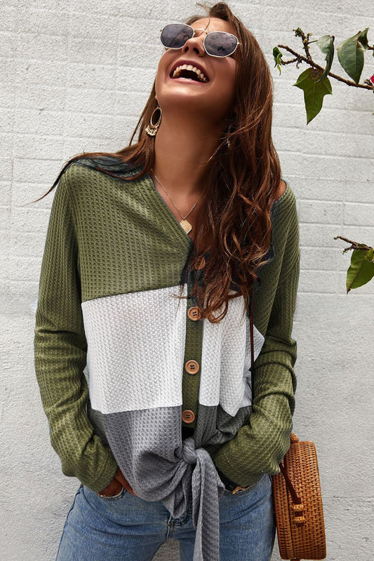 Pattern: Color block Features: Waffle knit, button detail, long sleeves Neckline: V-neck Stretch: No stretch...