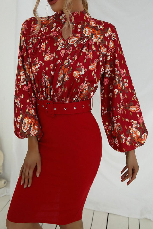 Pattern type: Floral Style: Classy Features: Belted Neckline: Mock neck Length: Knee length Sleeve length:...