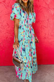 Abstract Print Short Puff Sleeve Tiered Maxi Dress
