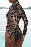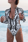 - Features: Cut-out, high-cut leg, zipper front, long sleeve