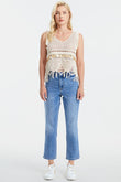 These high-waisted straight-leg trousers in a medium blue wash are the epitome of casual cool. With their classic whiskering and fading, they exude a laid-back, worn-in look. The asymmetrical design at the hem adds a unique and edgy touch, while the distressed effect gives them a vintage-inspired vibe. Perfect for pairing with a tucked-in blouse or a cropped sweater, these trousers are versatile and effortlessly stylish. Whether for a day at the office or a night out with friends, they'll be a go-to choice for adding a touch of casual sophistication to any outfit.