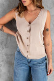 The button-front ribbed sleeveless top will be your go-to for any occasion. Pair with a pair of jeans, or dress up with a pencil skirt and heels.