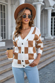 Button-Up Plaid V-Neck Dropped Shoulder Cardigan