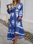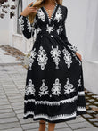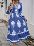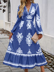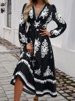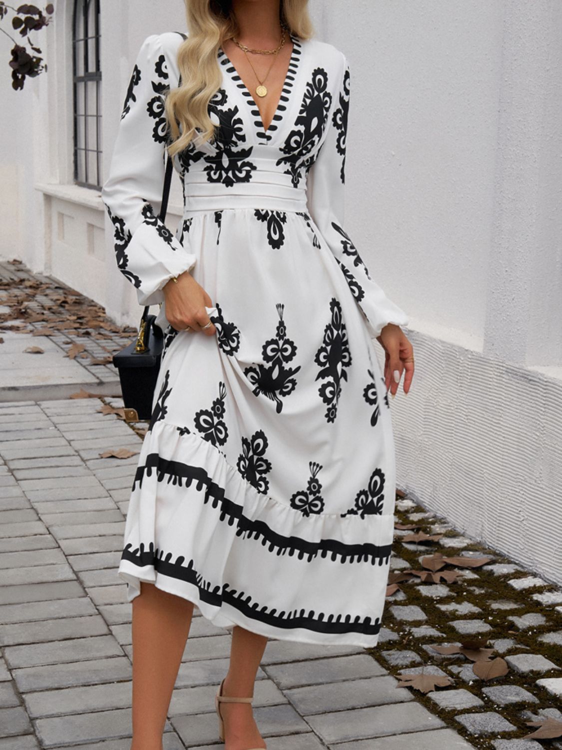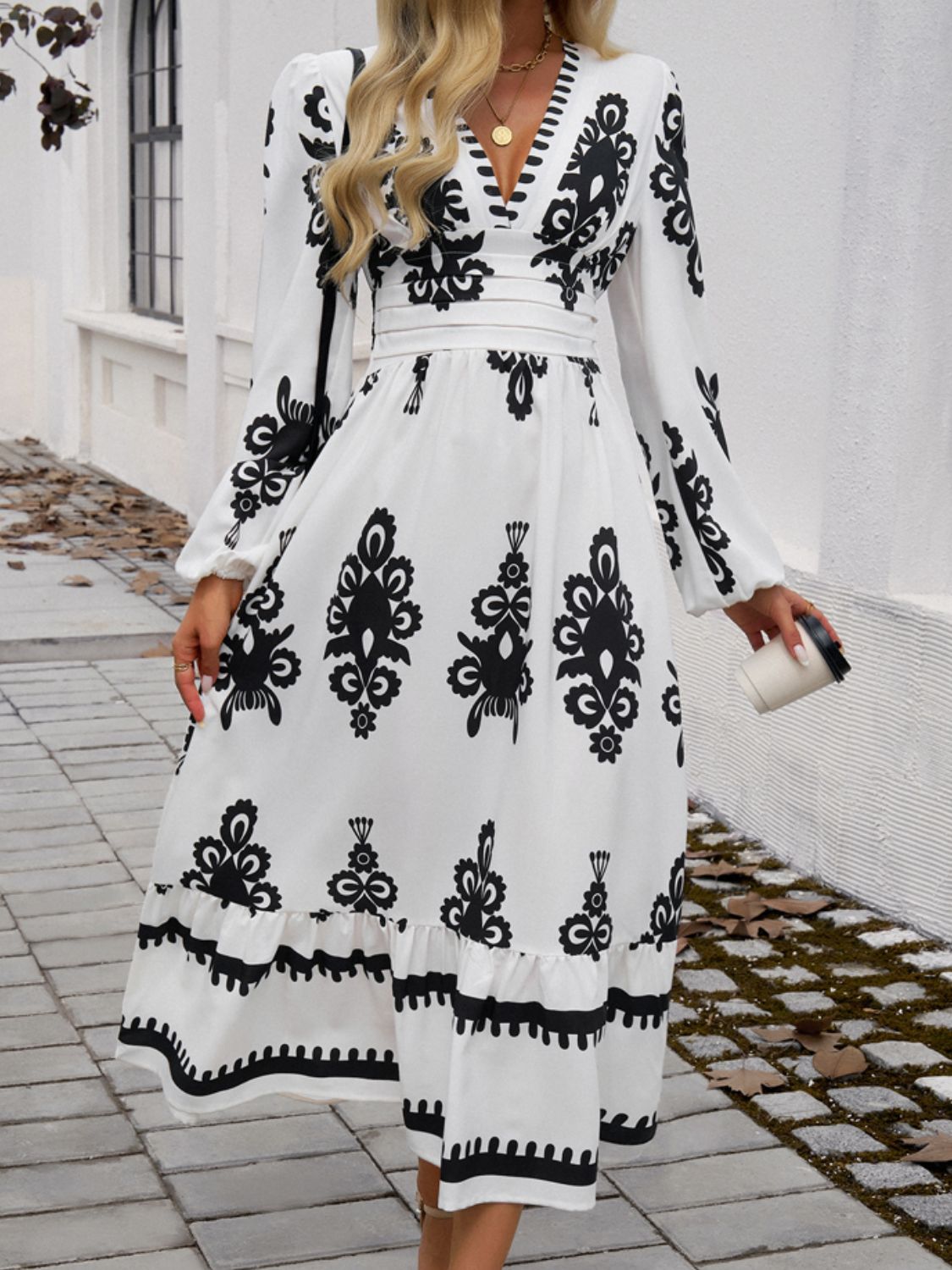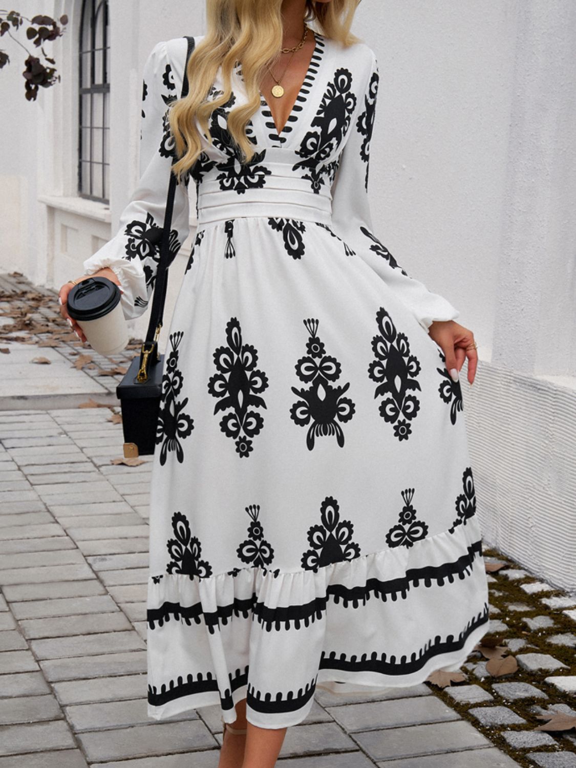 Devine Ruffled Printed Plunge Long Sleeve Dress