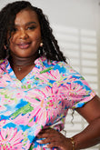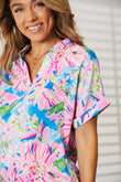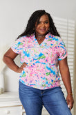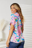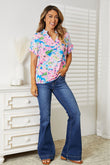 Make a statement with this Floral Notched Neck Short Sleeve Top. The beautiful floral print and unique notched neckline create a stylish and feminine look, perfect for adding a touch of elegance to your outfit.