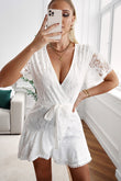 Floral Lace Pompom Detail Tie-Waist Flutter Sleeve Dress
