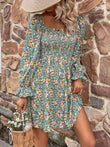 Floral Smocked Flounce Sleeve Square Neck Dress