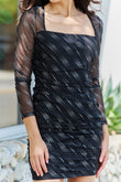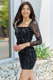 This dress combines a tantalizing mesh fabric with glitter embellishments, creating a captivating blend of sophistication and glamour. The bodycon silhouette of this dress is designed to accentuate your curves, hugging your figure in all the right places. The long sleeves add a touch of modesty while maintaining an alluring appeal. The square neckline frames your décolletage beautifully, exuding confidence and grace. Whether you're attending a cocktail party, a red carpet event, or a romantic dinner, this dress will make you feel sexy and classy simultaneously. The combination of mesh and glitter creates a striking visual effect that is bound to turn heads and make a lasting impression.