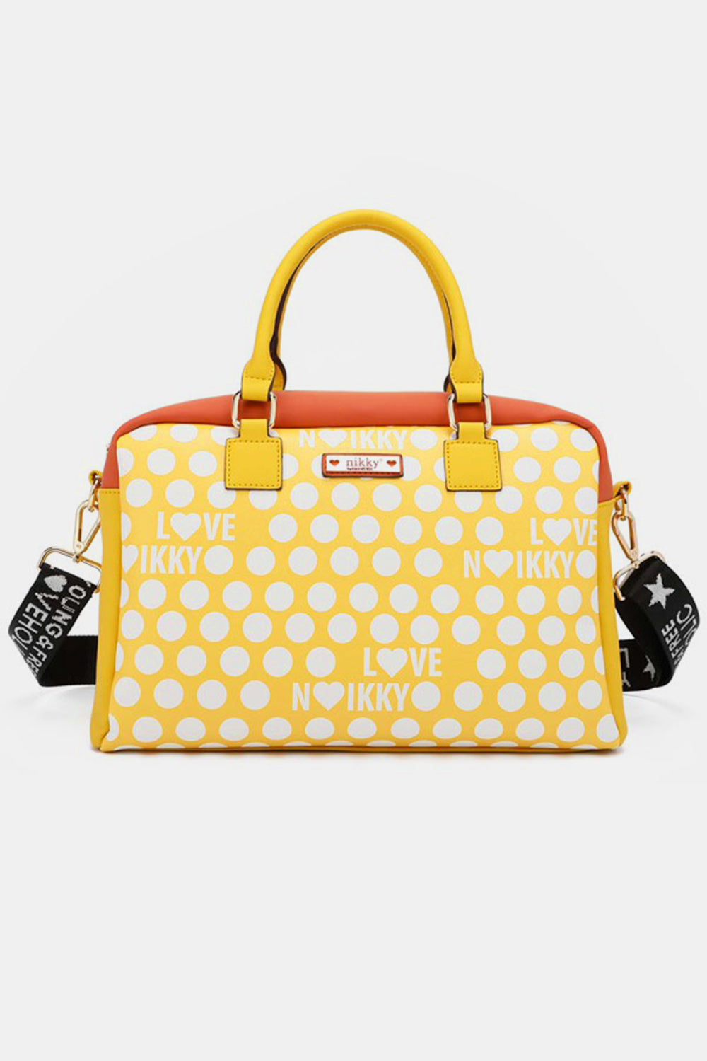 Large interior lined with signature Nikky polka dot print polyester fabric.