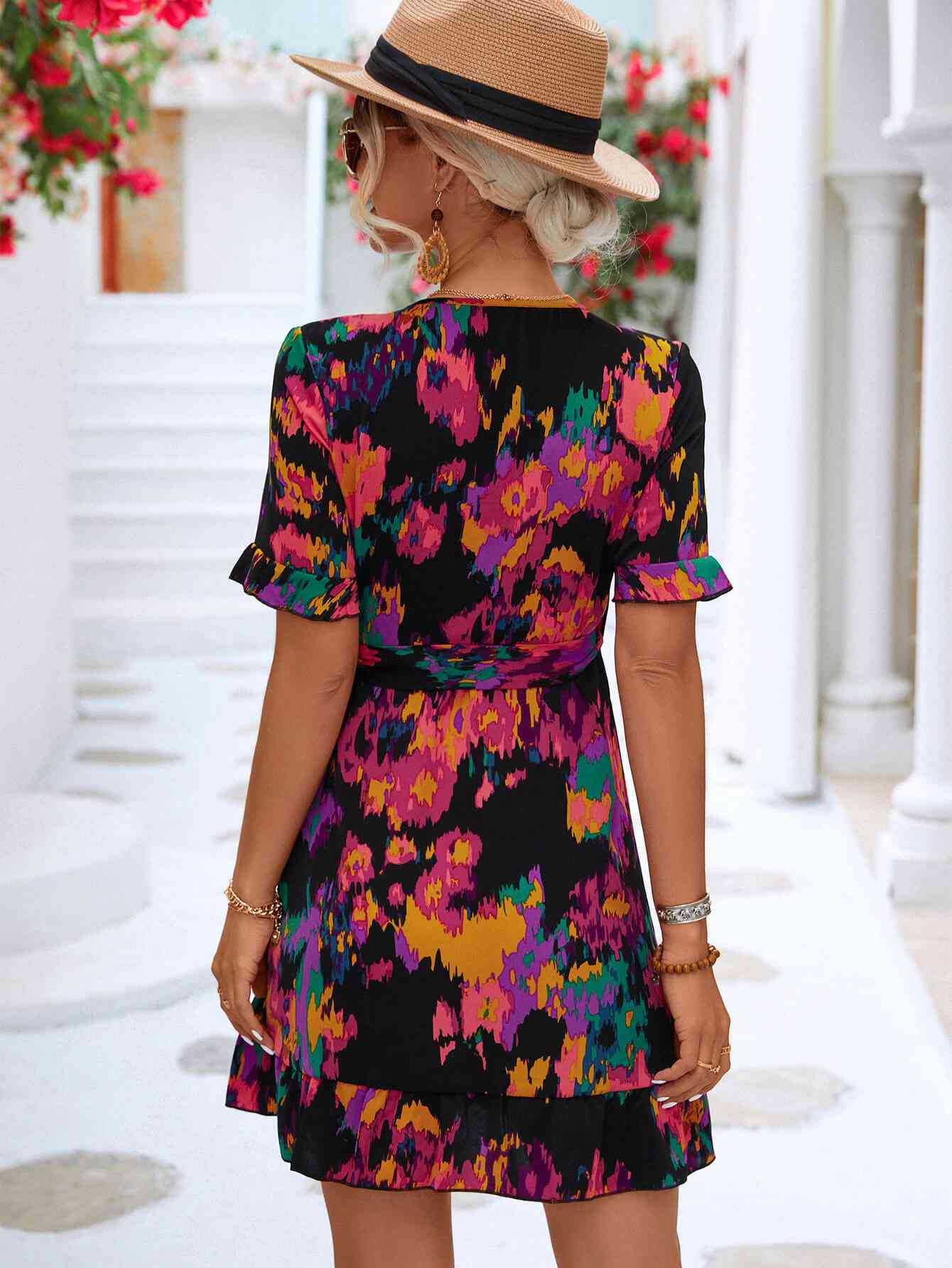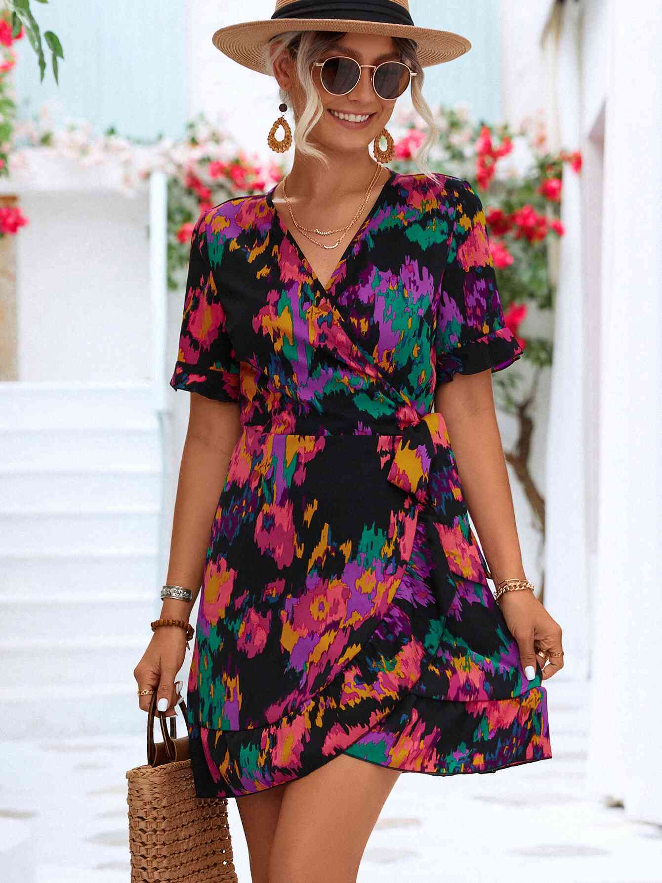 This printed flounce sleeve tied dress features short sleeves and a surplice neckline. It’s perfect for summer, but it works well year-round in your closet too!