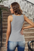 Create a skinny silhouette with a scoop neck design and a button placket. It perfect layer under a blazer or cardigan.
