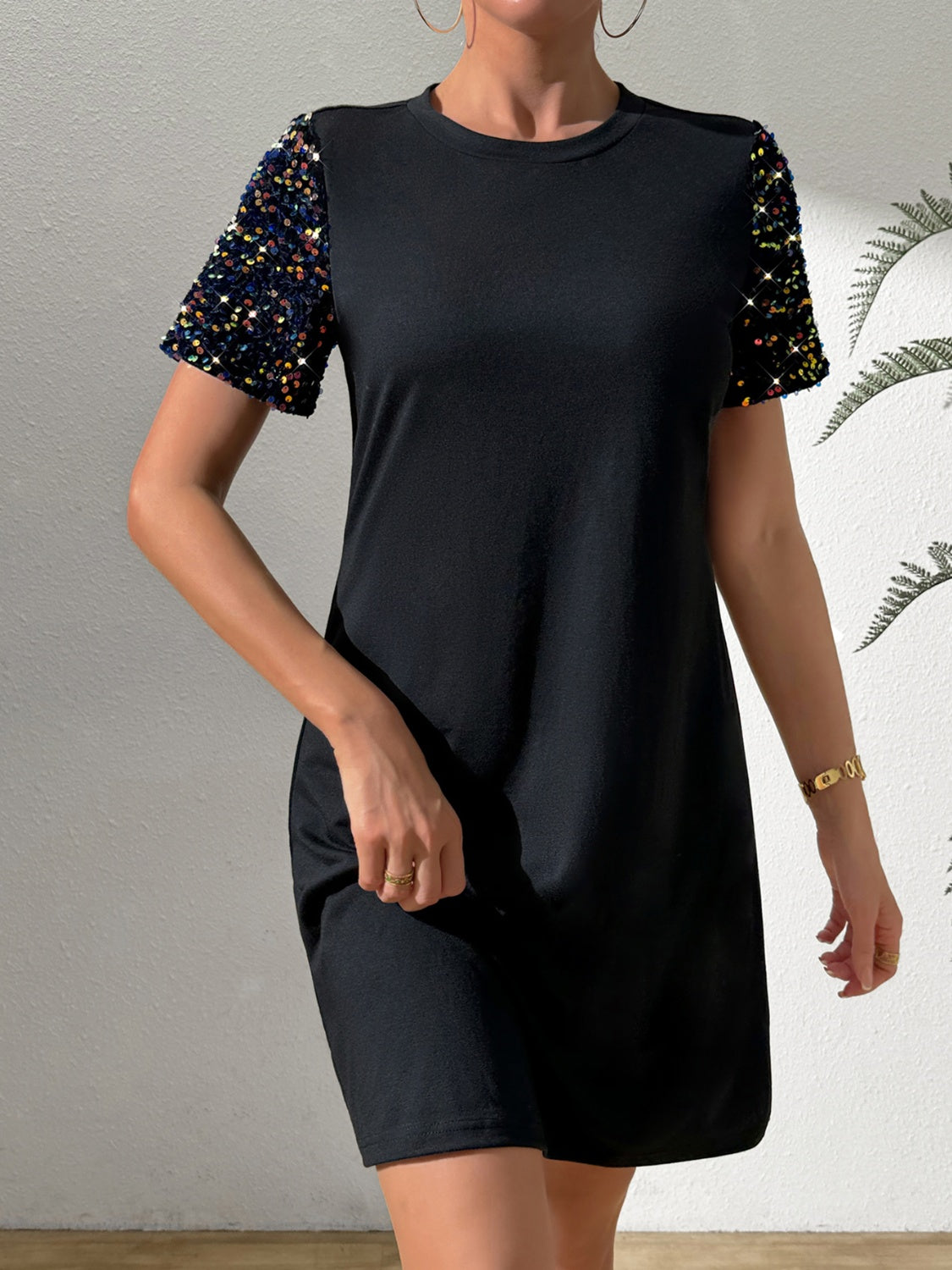 Sequin Round Neck Short Sleeve Mini Dress
