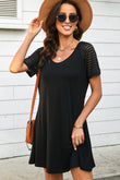 The perfect dress to wear on a casual day or date, this sheer striped dress features short sleeves and a scoop neckline.