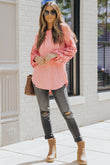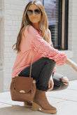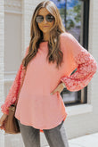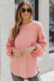 Spliced Lace Balloon Sleeve Waffle-Knit Tunic Top