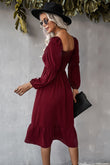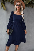Square Neck Ruffle Hem Long Bubble Sleeve Midi Dress
