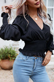 Surplice Neck Frill Trim Lantern Sleeve Smocked Waist Blouse
