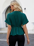 Surplice Neck Short Sleeve Front Tie Ruffle Hem Blouse