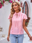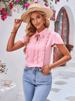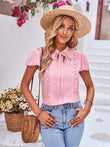 Tie Neck Frill Trim Puff Sleeve Top