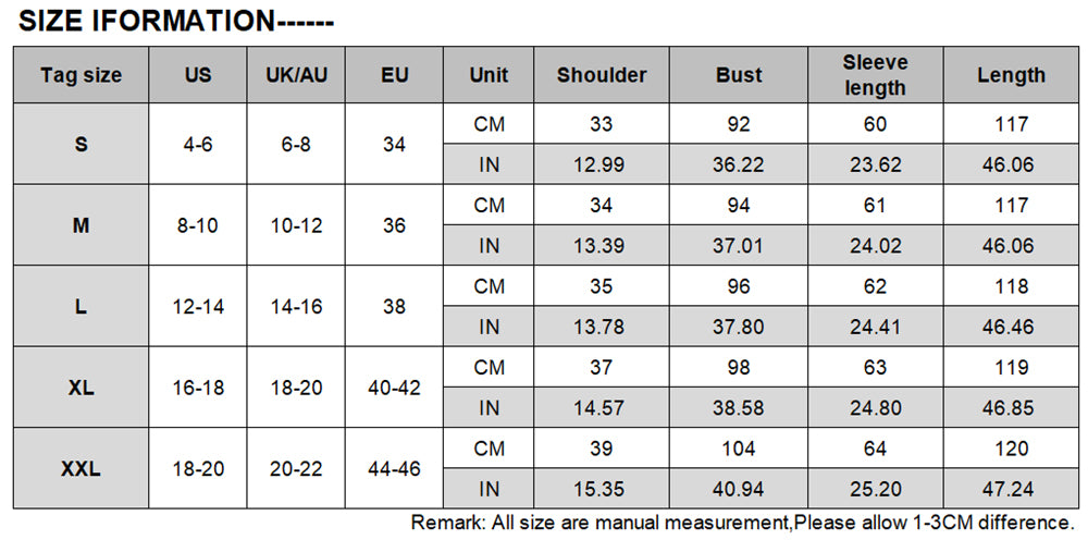 XL: shoulder 14.4 in, bust 38.2 in, sleeve length 24.6 in, length 46.4 in