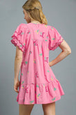 This charming mini dress features pink base adorned with delicate embroidered. Crafted from lightweight, breathable fabric perfect for warm weather, the dress showcases a relaxed silhouette with two tiers - an empire waist gathering and a flounced hem. The standout flutter sleeves with ruffled edges add feminine charm while maintaining comfort. The easy-care fabric blend ensures durability and wrinkle resistance, making it ideal for vacation wear, casual outings, or beach resort styling.