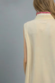 This stylish sleeveless mini dress features a relaxed silhouette crafted from lightweight, breathable fabric in a versatile beige tone. The standout design element is the contrasting pink trim that adorns the V-neckline and functional front pockets, adding a playful pop of color. The dress offers a comfortable, loose fit that flatters various body types while maintaining a polished appearance. Perfect for warm weather occasions, this piece transitions effortlessly from daytime casual to evening events. The mini length and sleeveless cut create a modern, youthful aesthetic, while the quality construction ensures durability and comfort throughout wear.