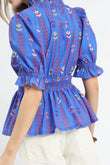 This charming vintage-inspired peplum blouse features a beautiful blue base with delicate floral prints over subtle stripes. Crafted from high-quality woven fabric, it showcases romantic puff sleeves with elastic cuffs, a flattering smocked waist, and decorative button-front detailing. The peplum silhouette creates an elegant feminine shape while the V-neckline adds sophistication. Perfect for both casual and semi-formal occasions, this blouse combines vintage charm with modern comfort and style.